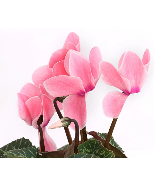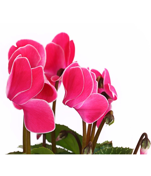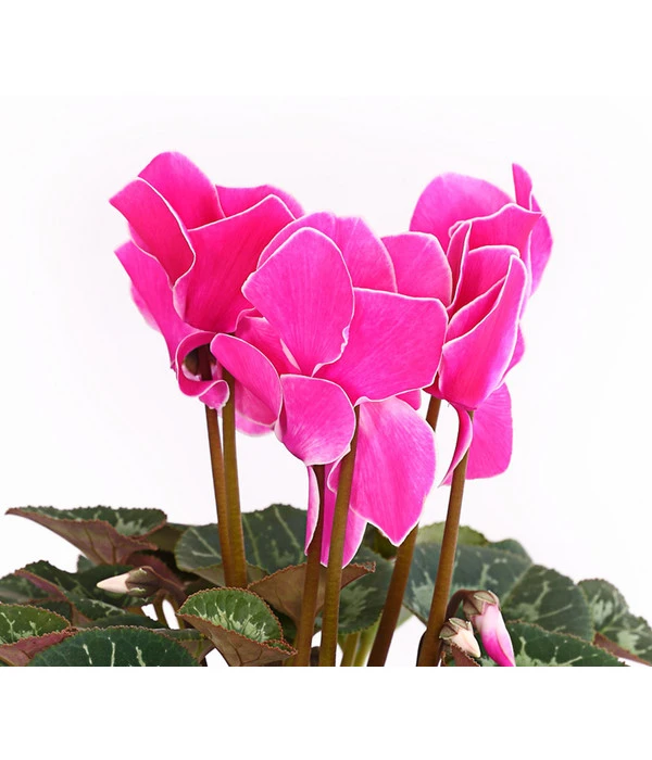 Aus einem kompakten Horst herzförmiger Blätter mit hübscher Zeichnung erheben sich schlanke Stiele, die Blütenköpfe tragen, wie sie schon unsere Urgroßmütter bezaubert haben. Sie leuchten in allen Variationen von strahlendem Weiß über zarte Rosé- bis zu kräftigen Pinktönen, mal größer, mal kleiner, manchmal sogar zweifarbig. Können Sie verstehen, warum diese reizvolle Zimmerpflanze in den letzten Jahrzehnten als altmodisch galt und aus vielen Wohnräumen verbannt wurde? Umso mehr freuen wir uns, dass das Alpenveilchen “wiederentdeckt“ wurde und seit einiger Zeit zur absoluten Modepflanze avanciert. Wenn auch Sie dem nostalgischen Flair der Cyclamen verfallen sind, geben Sie getrost Ihren Gefühlen nach und sichern Sie den Pflanzen gleich einen Logenplatz in Ihrem Zuhause. Bei dieser Sorte hier sind die samtweichen Blütenblätter mit einem feinen, weißen Rand versehen, was den optischen Reiz noch erhöht.
