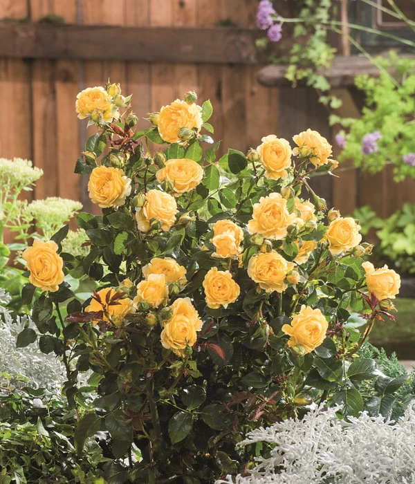 Mit dem Aufblühen der Beetrose ‚Inka®‘ hält der Sonnenschein in Ihrem Garten Einzug und lässt sich auch von dunklen Wolken nicht vertreiben. Ergänzen Sie die sonnengelbe Blütenfülle der Rose mit anderen gelb blühenden Stauden wie zum Beispiel Sonnenhut und Mädchenauge, während der niedrigerwachsende Frauenmantel seine zart gelben Blütenwolken im Vordergrund des Beetes auseiten darf. An jedem Tag ein echter Gute-Laune-Anblick!