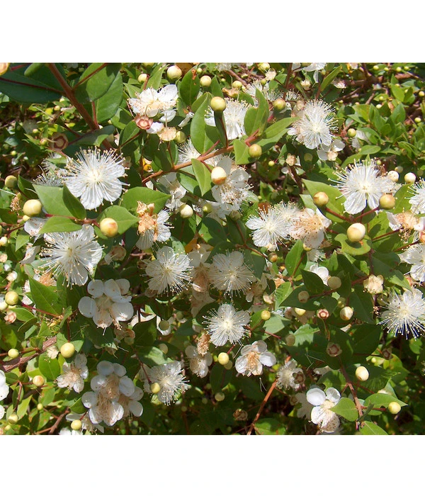 Mediterrane Kübelpflanzen sind in der Sommerzeit gern gesehene Gäste auf Balkon oder Terrasse. Zwar ist die Brautmyrte ein eher seltener Gast, doch der immergrüne Busch bereichert uns mit zierlichen Blüten und wohlriechendem Duft. Die dunkelgrünen Blätter der Myrte geben beim Zerreiben einen ätherischen Geruch ab, auch die kleinen, weißen Blüten verströmen ein angenehmes Aroma. Die Blüten entwickeln sich im Herbst zu dunkelroten bis gänzlich schwarze Beeren, die zwar essbar sind, aber keine große kulinarische Bedeutung haben. Das ätherische Öl der Myrte wird allerdings gerne in der Parfümindustrie verwendet und ist dort als Engelswasser bekannt. Bereits die Griechen und Römer sahen ein besonderes Symbol in der Brautmyrte. Der Legende nach, entstammte sie aus dem Paradies und galt als Symbol für Reinheit, Schönheit und Jungfräulichkeit. Nicht nur Aphrodite schmückte sich mit dieser Pflanze, auch in Deutschland wurde es im 16. Jahrhundert zur Sitte eine jungfräuliche Braut mit einem Myrtenkranz zu schmücken. Das erklärt auch ihren deutschen Namen.