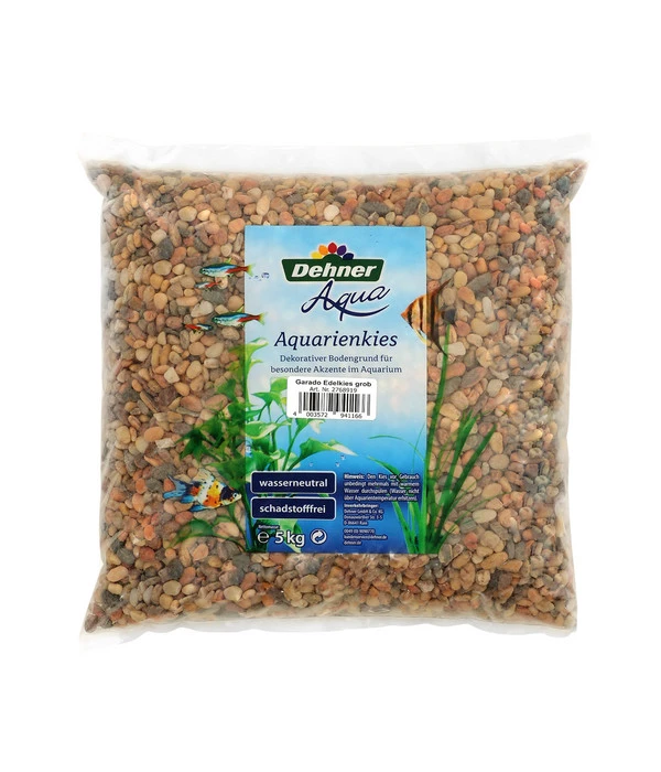 Der Dehner Aqua Garado Edelkies ist ein attraktiver Naturkies mit dem Sie ganz besondere Akzente in Ihrem Aquarium kreieren können. Die Kiesel in verschiedenen Brauntönen geben dem Aquarium Kies ein edles und natürliches Aussehen. Der dekorative Aquarium Bodengrund hat eine grobe Körnung mit einem Durchmesser von 6-8 mm und hat von Natur aus abgerundete Kanten, so dass sich die Fische nicht verletzen. Dieser hochwertige, wasserneutrale und schadstofffreie Aquarium Kies ist hervorragend für eine naturnahe Gestaltung Ihrer Unterwasserlandschaft geeignet. Mit dem attraktiven Garado Edelkies lassen sich bestens Erhebungen modellieren oder Übergänge kaschieren. Den Aquarium Kies vor Gebrauch unbedingt mehrmals mit warmen Wasser durchspülen, das Wasser aber nicht über Aquarientemperatur erhitzen.