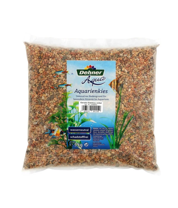 Der Dehner Aqua Garado Edelkies ist ein attraktiver Naturkies mit dem Sie ganz besondere Akzente in Ihrem Aquarium kreieren können. Die Kiesel in verschiedenen Brauntönen geben dem Aquarium Kies ein edles und natürliches Aussehen. Der dekorative Aquarium Bodengrund hat eine mittlere Körnung von 3-5 mm und hat von Natur aus abgerundete Kanten, so dass sich die Fische nicht verletzen. Dieser hochwertige, wasserneutrale und schadstofffreie Aquarium Kies ist hervorragend für eine naturnahe Gestaltung Ihrer Unterwasserlandschaft geeignet. Mit dem attraktiven Garado Edelkies lassen sich bestens Erhebungen modellieren oder Übergänge kaschieren. Den Aquarium Kies vor Gebrauch unbedingt mehrmals mit warmen Wasser durchspülen, das Wasser aber nicht über Aquarientemperatur erhitzen.