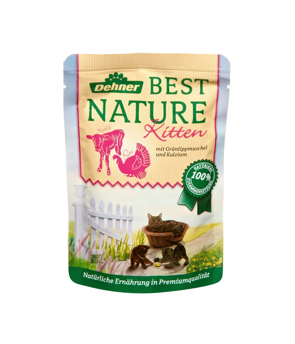 Dehner Best Nature Kitten mit Kalb, Pute, Grünlippmuschel und Kalzium im praktischen Portionsbeutel ist ein leckeres Katzenfutter mit einer einzigartigen Kombination aus natürlichen Zutaten in Premiumqualität. Das schmackhafte Katzenfutter beinhaltet alle Nährstoffe, die Ihre junge, heranwachsende Katze für einen optimalen Start benötigt. Dehner Best Nature Kitten Nassfutter ist auch für säugende Katzenmütter geeignet. Durch das schonende Garverfahren und die Kaltabfüllung beim leckeren Katzenfutter wird gewährleistet, dass die ursprünglichen, natürlichen Nährwerte weitestgehend erhalten bleiben. Diese hochqualitative Vollnahrung für Kitten beinhaltet wertvolle Proteine und liefert die für den Stoffwechsel unverzichtbaren essentiellen Omega-3- und Omega-6-Fettsäuren. Erlesene pflanzliche Bestandteile im Nassfutter für Ihr Kätzchen bieten unter anderem komplexe Kohlenhydrate und Ballaststoffe, die wesentlich die Energiezufuhr und Darmfunktion optimieren. Selbstverständlich wird bei der Herstellung von Dehner Best Nature Nassfutter für junge Katzen konsequent auf chemische Farb-, Lock- und Aromastoffe sowie gentechnisch veränderte Zutaten verzichtet.