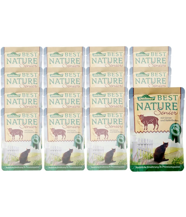 Dehner Best Nature Senior mit Lamm, Gerste und Haferflocken im praktischen Portionsbeutel ist eine einzigartige Kombination mit natürlichen Zutaten in Premiumqualität. Es wurde optimal an die speziellen Ernährungsanforderungen der Katzen ab 8 Jahren angepasst. Das schonende Garverfahren und die Kaltabfüllung gewährleisten, dass die ursprünglichen, natürlichen Nährwerte weitestgehend erhalten bleiben. Diese hochqualitative Vollnahrung beinhaltet hochwertigste Proteine und liefert die für den Stoffwechsel unverzichtbaren, essentiellen Omega-3- und Omega-6-Fettsäuren. Erlesene pflanzliche Bestandteile bieten unter anderem komplexe Kohlenhydrate und Ballaststoffe, die wesentlich die Energiezufuhr und Darmfunktion regeln. Selbstverständlich verzichten wir auf chemische Farb-, Lock- und Aromastoffe sowie gentechnisch veränderte Zutaten.