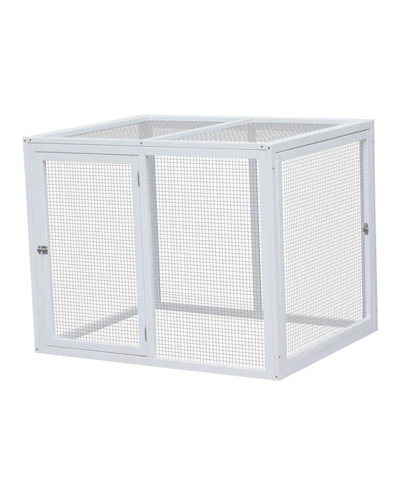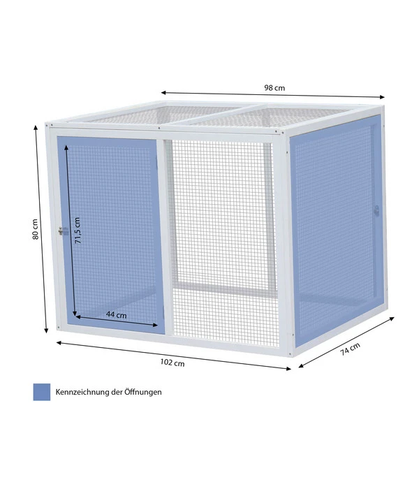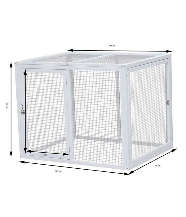 Der Dehner Freilauf Florenz besteht aus starkem, robustem Tannenholz und Gitterflächen aus Draht. Da der Draht verzinkt ist, ist das Gitter bestens vor Korrosion geschützt und kann unbedenklich draußen unter freiem Himmel eingesetzt werden. Das Freilaufgehege ist außerdem mit zwei Türen ausgestattet, die mittels Metall- und Federverriegelung geöffnet und geschlossen werden können. Das Dach ist abnehmbar, so dass der Innenraum bequem zugänglich ist, zum Beispiel fürs Reinigen des Geheges.