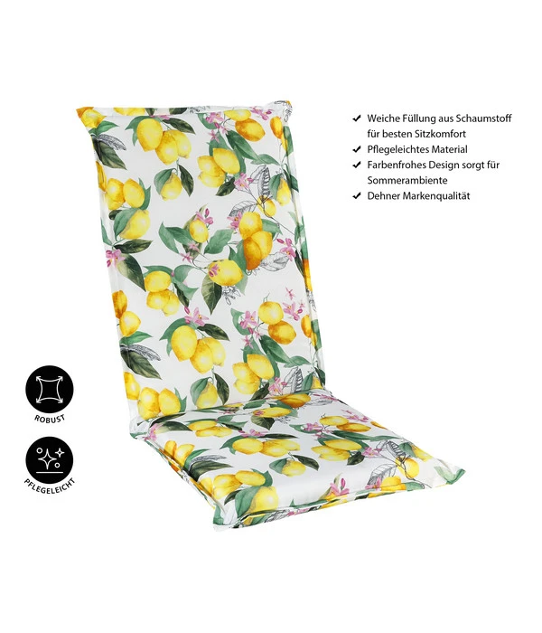 Das Hochlehnerpolster ‚Menton‘ von Dehner präsentiert sich im wundervollen, farbenfrohen und vielfach kombinierbaren Limonendesign, das an den letzten Urlaub in Bella Italia erinnert und Lust auf den nächsten Trip macht. Im Sommer sorgen Sie mit dem Polster für perfektes Ambiente, ganz gleich, ob es beim Barbecue mit Freunden oder einfach allein bei einem leckeren Cocktail und einem guten Buch sein soll. Dank des Bezugs aus reinem Polyester und der weichen Schaumfüllung aus Polyurethan vereint das Polster eine pflegeleichte Handhabung mit maximaler Gemütlichkeit. Entscheiden Sie sich jetzt für das Hochlehnerpolster ‚Menton‘ aus dem Hause Dehner, das Ihnen gewohnte Markenqualität garantiert und zu einer Wohlfühlzeit im Außenbereich beiträgt.