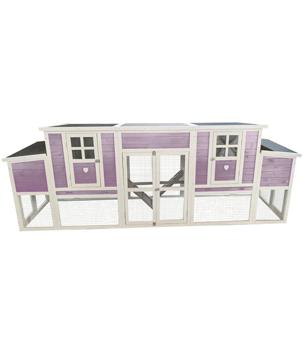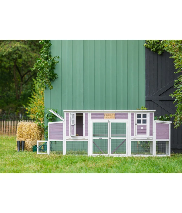 Sie wollen frisch gelegte Eier zum Sonntagsfrühstück genießen und deswegen eigene Hühner in Ihrem Garten halten? Dann ist der Hühnerstall Happy Farm Henriette von Dehner die ideale Behausung, um die Tiere komfortabel zu beherbergen. Durch den engen Maschendraht sind Ihre gefiederten Freunde optimal vor Feinden im Freiluftbereich gesichert, sodass Sie immer mit einem guten Gefühl nach draußen schauen können. Das werden Sie auch gerne tun, denn dieser farbenfrohe Stall ist ein echter Hingucker. Der fröhliche Farbton und die hübschen Verzierungen ziehen die Blicke Ihrer Gartenbesucher magisch an, sodass Ihre Hühner immer in bester Gesellschaft sind. In der Mitte des Stalls befindet sich eine Holzstange, auf der Ihre Hühner stehen können. Zudem sind beide Rückzugshäuser mit einer bequemen Sitzstange versehen.