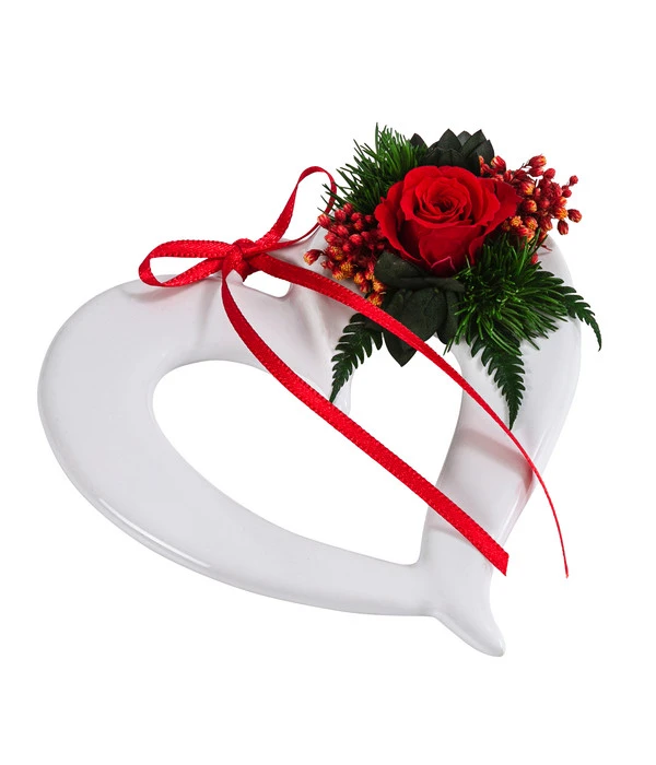 Ein liebevoll gestaltetes Accessoire: das Keramikherz mit Longlife-Rose ‚Evelin‘