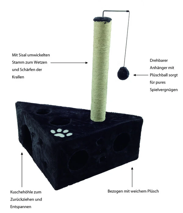 Beim Dehner Kratzbaum Tammy kommt bei Ihrer Katze bestimmt keine Langeweile auf. Der Katzenkratzbaum hat trotz seiner geringen Größe von 45 x 68 x 45 cm (B x H x T) viel zu bieten! Neben einem mit Sisal umwickelten Stamm, an dem Ihre Katze ihrem Kratzbedürfnis nachgehen und sich der wichtigen Krallenpflege widmen kann, hängt ein drehbarer Spielzeuganhänger mit einem Spielball am Gummiband. Unten am dreieckigen Fuß befindet sich eine Kuschelhöhle, die außen mit Plüsch und innen mit Fleece bezogen ist. In die gemütliche Höhle kann sich Ihre Schmusekatze zurückziehen oder mit dem dort versteckten Katzenspielzeug am Gummiband spielen. Viel Abwechslung und pures Spielvergnügen bietet dieser in Dehner Markenqualität gefertigte Dehner Kratzbaum Tammy jeder Katze. Gerade wegen seiner Größe eignet sich der Katzenkratzbaum ideal für kleine Katzen und Kätzchen.