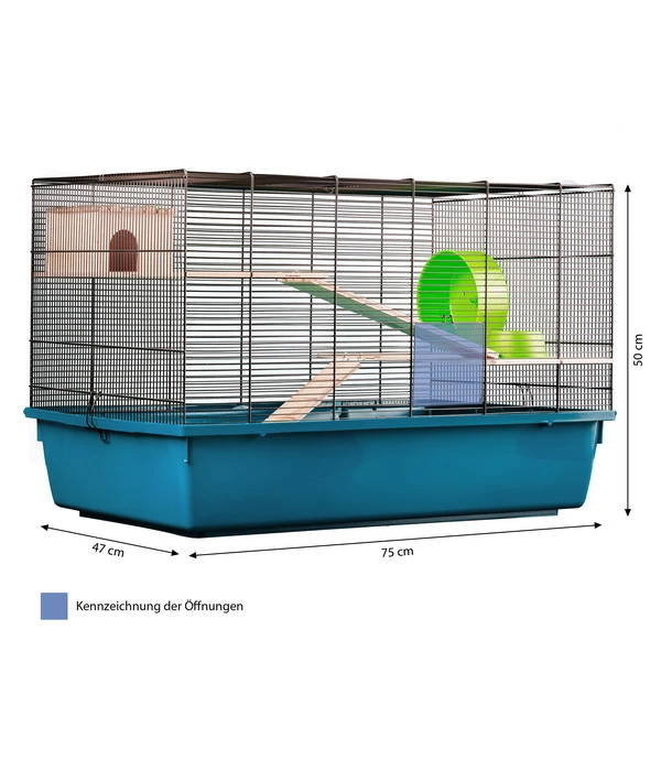 Sie wollen Ihrem Nager einen angenehmen Rückzugsort in Ihrem Indoor-Freigehege zukommen lassen? Dann ist das Nagerheim Paleromo von Dehner Lieblinge genau das Richtige für Sie. Hier kann Ihr Tier nach Lust und Laune buddeln, fressen und schlafen und das an einem Platz, der ihm zugleich Schutz und Ruhe bietet. Ausgestattet ist der praktische Käfig mit umfangreichem Zubehör. Gestalten Sie dieses gemütliche sowie mehretagige Heim für Ihren Kleinnager mit dem mitgelieferten Häuschen, dem Laufrad und dem Napf, damit er das Nagerheim Paleromo von Dehner vielseitig nutzen kann.