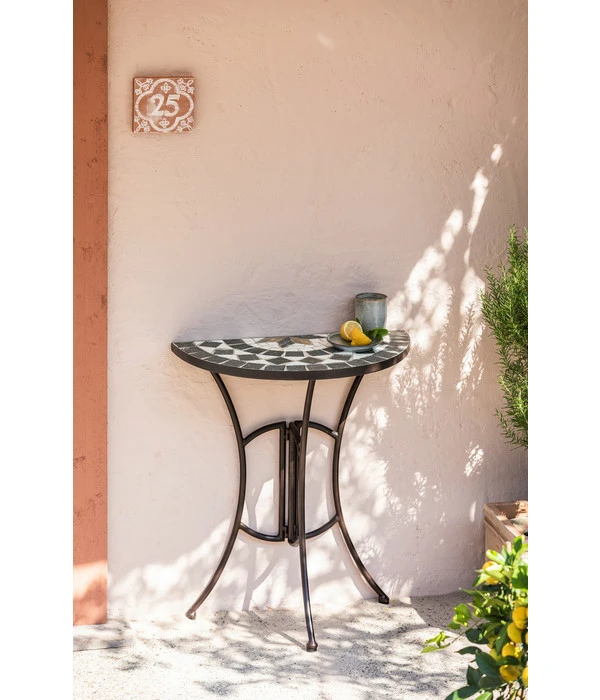 Sie möchten sich auch auf Ihrem heimischen Balkon oder Ihrer Terrasse wie im Urlaub fühlen? Der halbrund gestaltete Mosaiktisch Diana von Dehner bietet sich an, um in ruhigen Momenten Platz zu nehmen und einen Cappuccino zu genießen. Aber auch für ein gemütliches Essen zu zweit bietet dieser für den Außenbereich geeignete Tisch ausreichend Stabilität und Platz. Attraktive Funktionalität auch für kleinste Ecken Sie benötigen einfach mehr Abstellfläche, haben nur begrenzten Raum und wollen diesen auch nicht überladen? Der in Dehner Markenqualität gefertigte Mosaiktisch Diana macht als Dekorationsobjekt für kleine Räume wie auch als perfekter Balkontisch bei wenig Platz immer eine gute Figur. Durch die halbrunde Form nutzen Sie vorher wenig attraktive Wandbereiche sinnvoll und setzen nebenbei noch ein optisches Highlight.