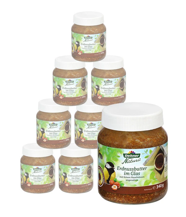 Die Dehner Natura Erdnussbutter im Glas mit feinen Haselnüssen besteht aus Rindertalg, Mais, Weizen, Erdnussmehl und Haselnussmehl. Dieser energiereiche und proteinhaltige Mix ist genau richtig, um die Vögel in Ihrem Garten im Winter warm zu halten und im Sommer ausreichend Kraft für die Aufzucht der nächsten Generation zu geben. Die Dehner Natura Erdnussbutter im Glas mit feinen Haselnüssen wird gerne von Kleibern, Buntspechten und Meisen angenommen, aber vielleicht werden Sie auch ein paar Überraschungsgäste am Vogelhaus beobachten können, die – gefällt ihnen das Restaurant – sich zu neuen Dauergästen entwickeln können.