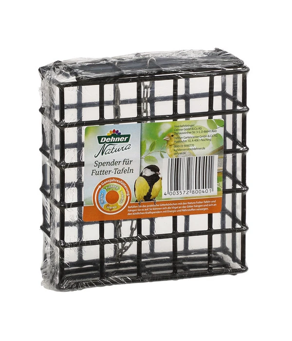 Nicht nur das Handling ist angenehm einfach, der Dehner Natura Spender für Futter-Tafeln besteht auch aus einem stabilen, wetterfesten Material, sodass Sie das Gitterkörbchen unbesorgt das ganze Jahr draußen im Freien hängen lassen können. Achten Sie aber bitte immer darauf, dass der Abstand zum Boden mindestens 150 cm beträgt, um die eifrig pickenden Vögel vor dem Angriff von Katzen und anderen Feinden zu schützen.