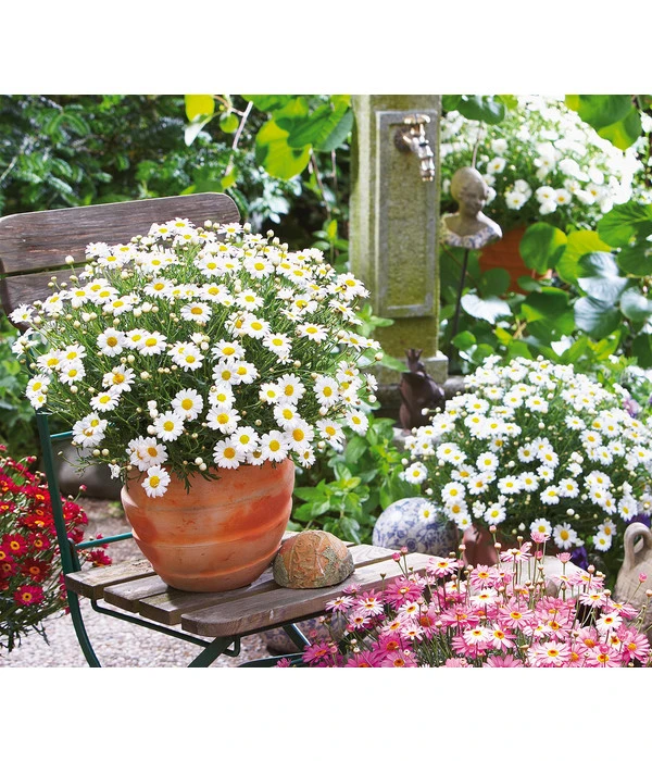 Aufgrund ihrer Größe eignen sich diese Margeriten optimal als Blühpflanze für sommerliche Balkonkästen oder Kübel. Mit der üppigen Blütenfülle und den strahlend weißen Blüten, sorgen sie vom Frühjahr bis zum Herbst für ein fröhliches Ambiente. Nach Lust und Laune können Sie verschiedene Balkonpflanzen mit der Margerite kombinieren. Harmonisch bepflanzt wirken Kästen mit dem kleinblütigen Zauberschnee, der Spinnenblume ‚Senorita Rosalita‘ und zweifarbigen Hängeverbenen. Wer es gerne bunt mag, kann die weiße Margerite mit blauen Männertreu, roten Geranien und gelben Husarenknöpfchen zusammen pflanzen. Da die meisten Beet- und Balkonpflanzen ähnliche Pflegebedingungen stellen, sind der Fantasie keine Grenzen gesetzt und somit lassen sich Margeriten individuell und für jeden Geschmack auf Balkon und Terrasse einsetzen