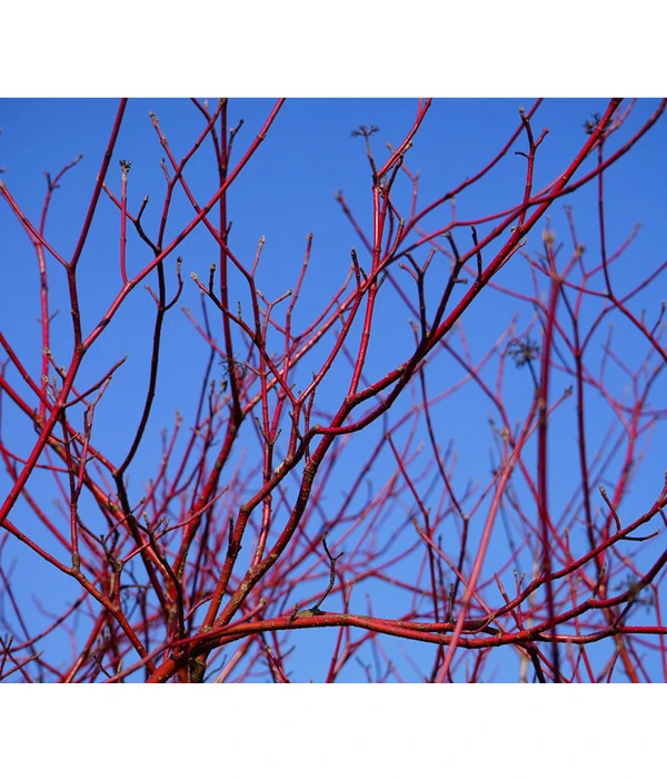 Manche Gehölze sind eine prächtige Zierde im sommerlichen Garten, im Winter aber bieten sie als kahler Strauch einen wenig attraktiven Anblick. Ganz anders ein Rotholziger Hartriegel ‚Sibirica‘. Wenn die Tage und Nächte kühler werden und sich die Natur auf den Winter vorbereitet, erlebt dieser Zierstrauch seinen optischen Höhepunkt im Jahr. Dann nämlich färbt sich sein Laub so spektakulär, dass selbst Ahorn Mühe hat, mit der Leuchtkraft der feuerroten Laubfärbung mitzuhalten. Und auch, wenn ein Rotholziger Hartriegel ‚Sibirica‘ sein Laub endgültig abgeworfen hat, führt er kein Mauerblümchendasein, sondern gibt den Blick frei auf die leuchtend roten Triebe, die den Zierstrauch zu einem ganz besonderen Hingucker im winterlichen Garten machen. Vor allem, wenn die roten Triebe einen Kontrast zu dem weiß verschneiten Garten bilden. Doch auch im Frühling und Sommer ist ein Rotholziger Hartriegel ‚Sibirica‘ ein Schmuck für jeden Garten. Sein Laub zeigt eine frischgrüne Farbe, die Blüten, die von Mai bis Juni erscheinen, sind cremeweiß und die Beeren später im Jahr ebenfalls weiß.